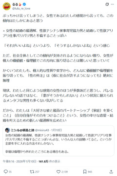 1: 2026/01/11(日) 18:57:45.11 ぶっちゃけ言ってしまうと、女性であるわたしの感覚から言っても、この傾向はたしかにあると思う> 女性の結婚の最適解、性欲ナシナシ家事育児協力男と結婚して性欲アリアリ仕事バリバリ男と不倫することっぽい「それがいいよね」というより、「そうするしかないよね」という感じ… — るる💃 (@lulu_re_love) January 10, 2026 ※関連記事 「明日から有給消化します。引継ぎはしません」←これに対する会社の最適解が明らかにwwwwww…