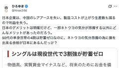 1:スピカ(茸) [US] 2026/01/11(日) 10:54:31.08 ID:ELY2SCeV0● BE:582792952-PLT(13000) 実業家の“ひろゆき”こと西村博之氏が10日、自身のX(旧ツイッター)を更新し、中国のレアアース規制を巡る動きを受け、日本への影響について私見を述べた。 ひろゆき氏は、産経ニュースが報じた「中国の一部国有企業がレアアースの新規契約停止 日本企業に伝達、既存契約の破棄も検討」と題した記事を引用。 そのうえで、「日本企業は、中国のレアアースを失い、製造コストが上がり、生産数も減るので利益を失う。日本のデメリットは明確だけど、一部ネトウヨの気分が昂揚する以外に、どんなメリットがあったのだろう。50代の単身世帯の4割は貯蓄ゼロなのに、ネトウヨの気分昂揚の為に損を出来る余裕が日本にあるんだっけ?」と私見をつづった…続きはソース元で 日本企業は、中国のレアアースを失い、製造コストが上がり生産数も減るので利益を失う。日本のデメリットは明確だけど、一部ネトウヨの気分が昂揚する以外にどんなメリットがあったのだろう。50代の単身世帯の4割は貯蓄ゼロなのに、ネトウヨの気分昂揚の為に損を出来る余裕が日本にあるんだっけ? pic.twitter.com/iWNMtlROnd— ひろゆき (@hirox246) January 10, 2026…