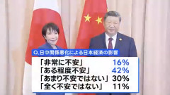 1:名無しさん@おーぷん 26/01/12(月) 09:05:40 ID:berS こいつら頭おかしいんか? 高市内閣支持率78.1% 先月調査から2.3ポイント上昇 JNN世論調査今年の日本の景気について聞いたところ、▼「良くなる」は18%、▼「悪くなる」は19%、▼「横ばい」は58%でした。中国が日本に対し、軍事転用の可能性がある品目について輸出を禁止すると発表しました。日中関係悪化による日本経済への影響について、どの程度不安か聞いたところ、▼「不安だ」と答えた人は「非常に」と「ある程度」をあわせて58%、▼「不安ではない」は「あまり」と「全く」をあわせて41%でした。…