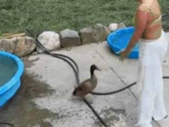 お母さんに1羽の鳥が近づいた。捕まえてプールに投げ入れる! → こうなります…