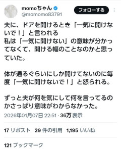 877 名前:既にその名前は使われています[] 投稿日:2026/01/08(木) 05:12:35.59 ID:PtAs+iBa まーんw 878 名前:既にその名前は使われています[] 投稿日:2026/01/08(木) 06:12:36.90 ID:YRr4ws+a 夫に言えよ 879 名前:既にその名前は使われています[] 投稿日:2026/01/08(木) 06:15:33.99 ID:Ro4GKhs+ 夫に聞いたら負けなんだよ 885 名前:既にその名前は使われています[] 投稿日:2026/01/08(木) 07:12:26.14 ID:qc0YH+U3 >>877 男「一気に閉めないで!」 888 名前:既にその名前は使われています[] 投稿日:2026/01/08(木) 07:50:34.78 ID:+EMKoMrG >>885 わかりやすくて優しい 889 名前:既にその名前は使われています[] 投稿日:2026/01/08(木) 07:50:43.73 ID:RVaI070R 身体が通る幅しか開けてないってことは 何かにぶつからないように開けることができてるってことじゃない? 理解はしてないが目的は達成できてるのでは 892 名前:既にその名前は使われています[] 投稿日:2026/01/08(木) 07:58:14.18 ID:2jH0ZMSY >>889 開ける速度の話 893 名前:既にその名前は使われています[] 投稿日:2026/01/08(木) 07:58:22.83 ID:boSYxk5X 体が通るの意味が横にしてなんとか通す じゃなくて普通に乗り降りするくらいの開け方で 全開じゃないよって意味の可能性もある、見てないとわからん話 で車なんかの乗り降りで前後ろくに見てないやつ多いからなぁ 当然こういうやつは運転も相応という 今日見た事故映像(ゴミ収集車がクラッシュ)も 事故車以外の車もろくに車間取ってないドライバーだらけだった 894 名前:既にその名前は使われています[] 投稿日:2026/01/08(木) 08:04:42.44 ID:aabwCMQH 女なんか丁字路の下から左右に曲がるときですらろくに左右の確認もしないで突っ込むからな 1つ先で頻繁に発生する可能性のあるトラブルすら考えられないんだろう…