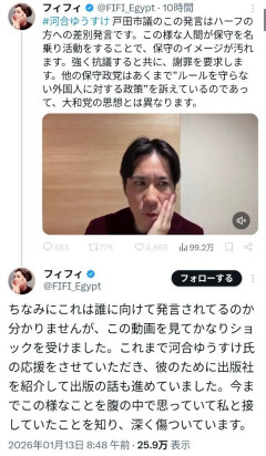 河合ゆうすけ「ハーフが日本政治語るな」→フィフィ「差別に深く傷つきました。謝罪を要求します」