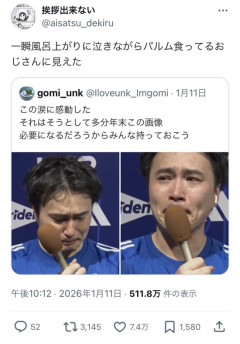 1: 名無しのアニゲーさん 2026/01/14(水) 03:08:31.322 ID:Q9AaGmju4 挨拶出来ない @aisatsu_dekiru (2026/01/11 22:12:36)一瞬風呂上がりに泣きながらパルム食ってるおじさんに見えた [引用元] gomi_unk @Iloveunk_Imgomi (2026/01/11 19:27:44)この涙に感動したそれはそうとして多分年末この画像必要になるだろうからみんな持っておこう 加藤純一のガチ泣きシーンがこちら…