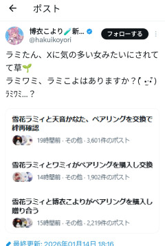 引用元: 6: Vtuberまとめ2026/01/14(水) 22:37:43.56 こよりのポスト ラミィの反応 28: Vtuberまとめ2026/01/14(水) 22:38:42.65 >>6 やっぱかなたへの扱いは別格だったな 30: Vtuberまとめ2026/01/14(水) 22:38:46.90 >>6 らみぃ最高www 47: Vtuberまとめ2026/01/14(水) 22:39:23.64 >>6 こよちゃん!? 96: Vtuberまとめ2026/01/14(水) 22:41:17.85 >>6 こよちゃん… そんな不憫なこよちゃんが好きです一生推しだよ 119: Vtuberまとめ2026/01/14(水) 22:42:07.78 >>6 ワミィってなに? 135: Vtuberまとめ2026/01/14(水) 22:42:45.15 >>6 またこよちゃん食え食えしてる… 146: Vtuberまとめ2026/01/14(水) 22:43:11.85 >>6 博衣こよりさん、自分がまったく関係していないバズったポストに無理やり関わろうとしてしまう 156: Vtuberまとめ2026/01/14(水) 22:43:32.39 >>146 マジでいつものことすぎて何も感じなくなった 277: Vtuberまとめ2026/01/14(水) 22:48:03.99 >>6 ワミィ草 798: Vtuberまとめ2026/01/14(水) 23:10:11.03 >>6 この手の自分が自分がはさすがに引くんだよな ここまで酷いのでもなんjで言うと叩かれるからな あそこはこよりに首ったけだよ…