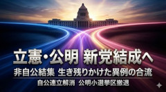 1: 名無し 2026/01/15(木) 08:15:24.48 ID:v9Xp7Km00 立憲民主党と公明党は14日、新党を結成する方針を固めた。23日召集の通常国会冒頭での衆院解散が迫る中、15日に両党首が会談し、合意を目指す。 公明はこの日、次の衆院選で小選挙区から撤退する方針を固めた。早期解散で選挙の準備が整わず、連立を解消した自民党の支援も見込めないことから、撤退を判断した。 立憲と公明両党の参院議員は残したまま、衆院議員のみで新党を立ち上げる方向だ。 朝日新聞 ■要約 ・立憲民主党と公明党が「新党結成」に向けた方針を固め、15日に党首会談を実施予定。 ・23日の国会冒頭解散を控え、非自公勢力の結集による生き残りを図る異例の合流。 ・公明党は自民党との連立解消を受け、次期衆院選の小選挙区から全面撤退する方針。 ・衆院議員が先行して新党へ移行し、参院議員は当面それぞれの党籍を維持する変則的な形態。 ■解説 高市政権による解散総選挙の電撃的な動きを前に、野党陣営から驚きの(野合)とも言える再編案が飛び出しました。立憲民主党と公明党という、安全保障や基本政策で大きな隔たりがあるはずの両党が、新党という形で手を組む背景には、単なる「選挙互助会」的な焦りが見て取れます。 特に公明党が自民党との連立を解消し、小選挙区から撤退を決めたことは、日本の政治史における大きな転換点です。これまで自民党の保守政策をブレーキ(中道)の名の下に制限してきた公明党が離脱したことで、高市政権はより明確に(日本の主権と安全保障)を強化する政策を打ち出しやすくなったとも言えるでしょう。 「中道」という旗印を掲げてはいますが、かつて厳しく対立していた組織同士が理念を横に置いて合流することに対し、有権者がどこまで納得するかは極めて不透明です。目先の議席維持のために、日本の根幹を支える防衛政策や憲法論議を曖昧にするような新党が、果たして(責任ある政治)を担えるのか。有権者には、単なる勢力図の変化ではなく、各候補者の国家観を厳しく問うことが求められます。 日経新聞「新宿区長が家庭ごみ有料化は23区で一斉に始めるのが望ましいとの考え方を示した」→ 新宿区長「記事を捏造。取材に答えた内容と異なる見出し... 【動画】 ブレ※※ングダウン18の試合前にビンタされた竜選手がくも膜下出血に。 【速報】 立憲・安住氏、総理大臣になったらやりたい事→「ODAで自分たち以外の国々も豊かにしてあげたい」…