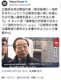 1 名前:名無しさん@涙目です。[sage] 投稿日:2026/01/13(火) 17:17:17.17 ID:UahF05zT0 3 名前:名無しさん@涙目です。[sage] 投稿日:2026/01/13(火) 17:17:58.72 ID:UahF05zT0 立憲民主党の野田佳彦代表は13日、取材に応じ、公明党との選挙協力の調整を急ぐ考えを示した。 12日の公明党・斉藤鉄夫代表との会談の手ごたえを聞かれた野田代表は「やっぱり高市総理に一泡吹かせたいなっていう思いの強さは感じましたので、強い連携を図ることができると思います。それぞれこれから党内手続きに入りますので、すみやかに手続きを終えたいと思います」と答えた。「相当スピード加速しないと23日解散ならば、相当程度早くやらないと。公示までの間には少なくともほぼいろんな調整が終わっているという形にしないといけないと思いますので、急ぎたいと思います」とも述べた。 また、解散について、「大義を感じないんですよ。イランでの軍事作戦もしかしたらあるかもしれません。そうなると、やっぱり原油の問題にかかわってきたりとか、政治空白を作れない状況だと思うんですよね。さっき言ったように、予算も切れ目なく執行する意味では暫定予算を組むんじゃなくて、提案をしてきた予算についてきちっと審議をして結論を出すというのが筋だと思うんですけど。政治空白を作るというのは、内外とも課題があるという時になぜなのかということは、もし解散を宣言するならば、ご説明いただかなければいけないなと思っています」と述べた。(ABEMA NEWS) 273 名前:名無しさん@涙目です。[] 投稿日:2026/01/13(火) 18:38:09.92 ID:D7hiwkLe0 >>3 行動原理が「国民のため」じゃなくてさすがに草 だからお前らは何をやってもダメなんだよw 719 名前:名無しさん@涙目です。[] 投稿日:2026/01/14(水) 06:31:04.91 ID:gwMqfjQT0 >>3 > 政治空白を作れない状況だと思うんですよね。 あのな だったら岡田みたいなトラップ質問で時間潰してないでもっと建設的な議論しとけよタコ 2 名前:名無しさん@涙目です。[sage] 投稿日:2026/01/13(火) 17:17:57.33 ID:gCirLWr90 遊んでるのか? 287 名前:名無しさん@涙目です。[] 投稿日:2026/01/13(火) 18:49:12.94 ID:Ep5ynOAa0 >>2 それが奥さん真面目にやってこれなんですよ! 17 名前:名無しさん@涙目です。[sage] 投稿日:2026/01/13(火) 17:20:30.94 ID:aSO8+h0L0 政治って何なんだろうか(哲学) 14 名前:名無しさん@涙目です。[] 投稿日:2026/01/13(火) 17:20:17.77 ID:PACCbIPA0 どこ向いて政治しとるんやろな 49 名前:名無しさん@涙目です。[sage] 投稿日:2026/01/13(火) 17:26:53.65 ID:Hy5G17vu0 >>14 自民に逆らうこと 11 名前:名無しさん@涙目です。[sage] 投稿日:2026/01/13(火) 17:20:11.74 ID:KHPq9GpV0 そういう低俗なモチベーションで国政やらんといてもらえますか 4 名前:名無しさん@涙目です。[sage] 投稿日:2026/01/13(火) 17:18:34.36 ID:6kl1qzG70 いや政策で連携しなよ 公明党は選択ミスると消えるぞ 256 名前:名無しさん@涙目です。[] 投稿日:2026/01/13(火) 18:32:15.10 ID:1Lrlyjz40 >>4 ほんこれ だから野ダメなんだよ 26 名前:名無しさん@涙目です。[] 投稿日:2026/01/13(火) 17:22:33.16 ID:WJE4/xfN0 というかさぁ! 高市早苗に一泡吹かせたいから協力?マジで志が低いな。 本当に馬鹿なのか? 頭がおかしいとしか言えない 25 名前:名無しさん@涙目です。[] 投稿日:2026/01/13(火) 17:21:54.72 ID:2MejNZii0 学会は燃えてるよ 仏敵高市に目にものを見せてやると 92 名前:名無しさん@涙目です。[] 投稿日:2026/01/13(火) 17:37:53.53 ID:rIKvgxZO0 >>25 草 28 名前:名無しさん@涙目です。[] 投稿日:2026/01/13(火) 17:22:57.25 ID:PxmFnzbW0 >>25 それやったら公明党の議席めっちゃ減るけど それでいいの? 40 名前:名無しさん@涙目です。[sage] 投稿日:2026/01/13(火) 17:25:24.14 ID:XabH7Xkb0 >>28 公明党なんていうカルト集団、なんもせんでも議席数減るやろ😂 31 名前:名無しさん@涙目です。[] 投稿日:2026/01/13(火) 17:24:01.10 ID:PWXf3jxr0 >>25 同じ話を、創価企業の人から聞いたけど 野党転落したおまえらに何が出来るの?と すごい疑問だったわ 663 名前:名無しさん@涙目です。[] 投稿日:2026/01/14(水) 03:11:05.97 ID:rweO4c3I0 >>31 うちの会社のお偉いさんはある市の創価幹部やけど話題になっても落ち着いてるし敵意とかなんにも口に出さないけどなあ。 公明党は公明党、なんにもかわらんって言うだけで 670 名前:名無しさん@涙目です。[sage] 投稿日:2026/01/14(水) 03:43:23.62 ID:b2Va4Fr60 >>663 しょうもない擁護だな 公明が反日なのはハッキリしたからな 672 名前:名無しさん@涙目です。[] 投稿日:2026/01/14(水) 03:45:18.77 ID:3oxjY9gT0 >>670 今後は与党復帰無理なのが 笑えてしょうがない 30 名前:名無しさん@涙目です。[] 投稿日:2026/01/13(火) 17:23:12.27 ID:JKcnSXc/0 高市個人に一泡吹かせたいっていう理由だけで連立 中国の指示だとすると中国も相当に焼きが回ってんな 16 名前:名無しさん@涙目です。[] 投稿日:2026/01/13(火) 17:20:30.69 ID:PxmFnzbW0 立憲が創価信者の票をあてにするのは判るんだが、それは公明党側にどんなメリットあるんだ? 51 名前:名無しさん@涙目です。[] 投稿日:2026/01/13(火) 17:27:40.97 ID:4pVARKwH0 公明だけでは組織票が弱い 共産とも再度組んでおけ 46 名前