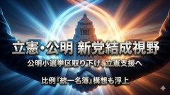 1: 名無し 2026/01/15(木) 08:42:15.56 ID:k9Xm7Rk10 立憲民主、公明両党は、衆院選に向けて新党結成を視野に選挙協力を進める調整に入った。公明は斉藤鉄夫代表ら現職議員を含め小選挙区から撤退し、全国各地で立民側の候補を支援する案が浮上している。立民内にあった「統一名簿」構想をさらに進展させ、中道勢力を結集して高市政権に対抗する構えだ。選択的夫婦別姓制度の導入推進や、自民党派閥裏金事件を受けた政治改革を共通政策に掲げる方向で検討している。 共同通信(47NEWS) ■要約 ・立憲民主党と公明党が新党結成を視野に、衆院選での全面的な選挙協力を調整中。 ・公明党は斉藤代表ら現職を含む小選挙区候補を取り下げ、立憲候補を支援する方針。 ・比例代表では各党の候補を同一名簿に載せる「統一名簿」構想を推進する。 ・共通政策として、選択的夫婦別姓の導入や政治資金問題を受けた改革を掲げる。 ・15日に立憲が両院議員総会を開催し、野田・斉藤両代表による党首会談も模索されている。 ■解説 立憲民主党と公明党による「新党結成」という極めて異例の動きは、高市政権が掲げる強力な保守・安保政策への強い危機感の表れと言えるでしょう。公明党が長年維持してきた小選挙区の議席を投げ打ってまで立憲と合流するのは、自民党との連立解消後、単独での生き残りが極めて困難であるという冷酷な現実を突きつけられた結果に他なりません。 しかし、「中道勢力の結集」という美名の下で行われるこの再編が、果たして国家の基本政策、特に安全保障や憲法観において一貫性を持てるのかは甚だ疑問です。選択的夫婦別姓などのリベラル寄りの政策で妥協点を見出したとしても、緊迫するアジア情勢の中で日本をどう守るかという「国家の根幹」を曖昧にしたままの数合わせは、有権者の目には単なる(選挙互助会)と映るリスクが高いでしょう。 高市総理が進める日米同盟の深化や経済安保の強化といった「現実的な国益」を重視する路線に対し、理念を横に置いた野合的な勢力がどこまで対峙できるのか。この政界再編は、日本の進むべき道が(強い主権国家)か(曖昧な現状維持)かを問う、かつてないほど鮮明な対立軸を国民に提示することになりそうです。 日経新聞「新宿区長が家庭ごみ有料化は23区で一斉に始めるのが望ましいとの考え方を示した」→ 新宿区長「記事を捏造。取材に答えた内容と異なる見出し... 【動画】 ブレ※※ングダウン18の試合前にビンタされた竜選手がくも膜下出血に。 【速報】 立憲・安住氏、総理大臣になったらやりたい事→「ODAで自分たち以外の国々も豊かにしてあげたい」…