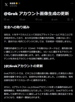 627: 名無し 2026/01/15(木) 11:32:09.36 ID:g65v+sKE0うわああああああ(´・ω・`) X、Grokでのビキニ画像を技術的に禁止 画像生成は有料プランのみに…