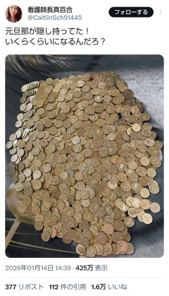 1: 2026/01/15(木) 13:15:54.76 元旦那が隠し持ってた!いくらくらいになるんだろ? pic.twitter.com/rBtrjGDB0J— 看護師長真百合 (@CaitlinSch51445) January 14, 2026 ※関連記事 【画像】株に全財産と運をかけた男の末路が悲惨すぎる…