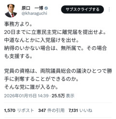 1:2026/01/15(木) 16:06:07.64 ID:oVjXeUUi0.net 2BP(5555)立憲・公明合流で新党「中道改革」結成へ 原口一博氏が離党勧告を暴露し波紋事務方より。20日までに立憲民主党に離党届を提出せよ。中道なんとかに入党届けを出せ。納得のいかない場合は、無所属で。その場合も支援する。党員の資格は、両院議員総会の議決ひとつで勝手に剥奪することができるのか。そんな党に誰が入るか。— 原口 一博 (@kharaguchi) January 15, 2026転載元スレッド:…