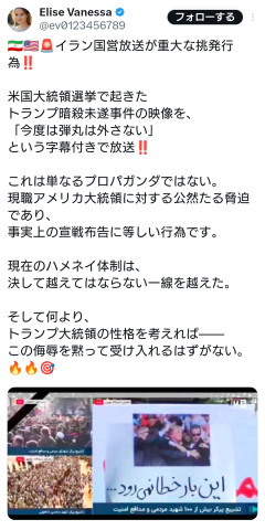 イラン国営放送「かかってこいやトランプ!頭部に弾丸食らわしてやる」