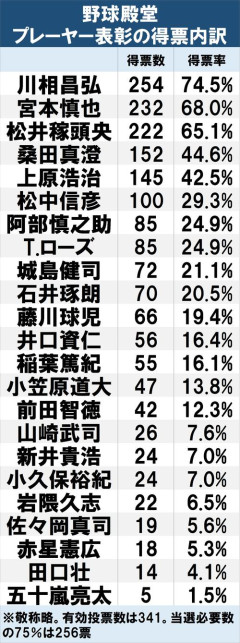 1: それでも動く名無し 2026/01/15(木) 19:02:00.20 ID:30pO6gGV0 投票内訳野球殿堂博物館は15日、今年の殿堂入りメンバーを発表した。プレーヤー表彰は選出者がいなかった。 今年から候補入りした阪神監督の藤川球児氏(45)は、66票(得票率19・4%)だった。選出には得票率75%が必要で、今回は256票。来年以降の上積みが期待される。 ◆プレーヤー部門 引退後5年経過したプロ選手が対象。15年間を有資格者とする。野球報道15年以上の経験を持つ委員が投票。得票率が有効投票数の3%未満の場合は、次年度以降の候補者になれない。…