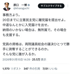 1 名前:[] 投稿日:2026/01/15(木) 16:06:07.64 ID:oVjXeUUi0 ?2BP(5555) 立憲・公明合流で新党「中道改革」結成へ 原口一博氏が離党勧告を暴露し波紋 3 名前:[] 投稿日:2026/01/15(木) 16:07:30.64 ID:y8zpKLQj0 ワロタ 2 名前:[] 投稿日:2026/01/15(木) 16:07:07.59 ID:pHbv33fr0 そりゃそうだろw 8 名前:[] 投稿日:2026/01/15(木) 16:08:29.58 ID:shurgGJs0 たまにまともなこと言うのやめろ 4 名前:[] 投稿日:2026/01/15(木) 16:07:48.57 ID:REi9sfW40 正気に戻っててわろす 7 名前:[] 投稿日:2026/01/15(木) 16:08:14.60 ID:CG9e/mcm0 まぁそらそうよな でもマトモになった原口さんこれからどうするの? 185 名前:[] 投稿日:2026/01/15(木) 17:56:08.08 ID:H/MJtD8n0 中道って詐欺に近いだろ 極左革命党のほうがしっくりくる 5 名前:[sage] 投稿日:2026/01/15(木) 16:07:56.32 ID:kuPSrCMQ0 中革派の誕生である(;´Д`) 55 名前:[sage] 投稿日:2026/01/15(木) 16:21:36.15 ID:WG+73GRa0 >>5 中核も革マルも呉越同舟 36 名前:[] 投稿日:2026/01/15(木) 16:13:19.62 ID:xlhXWZ710 本当、こいつら評判が悪くなる度に党名を変えやがる 52 名前:[] 投稿日:2026/01/15(木) 16:19:39.99 ID:n+iuU3il0 離党しなかったらどーなんだこれ? 参議院あるから解党はしないから残るだろ? 原口代表で運営すりゃいいんじゃね 10 名前:[] 投稿日:2026/01/15(木) 16:08:56.13 ID:Hbea4m1N0 離党しなければ政党助成金残るな 84 名前:[sage] 投稿日:2026/01/15(木) 16:31:35.98 ID:XWB4tkc20 >>10 公明党と組みたい人達だけ出て行ってもらった方が 政党助成金も残るし、いいんかもな 23 名前:[] 投稿日:2026/01/15(木) 16:10:47.90 ID:7Br3Nb000 衆院だけこれやんのかな 参院や地方はどうすんだwおもしれえ 14 名前:[sage] 投稿日:2026/01/15(木) 16:09:22.98 ID:taEPaNhS0 で、いつ出るのよ口ばっかりで 29 名前:[] 投稿日:2026/01/15(木) 16:11:43.42 ID:REi9sfW40 >>14 出るも何も党が無くなるのに 123 名前:[] 投稿日:2026/01/15(木) 16:55:54.62 ID:7DkhUgf30 >>14 両党とも残すってよ >両党は解党せず、衆院議員が離党して新党に参加する形を想定している。 選挙の時だけ中核派党で活動して、選挙終わったら戻るんじゃねーの? この場合、立憲・公明・中核派党の3党分の政党助成金も貰えるしね 158 名前:[] 投稿日:2026/01/15(木) 17:22:53.91 ID:t65QWFxq0 >>123 こんなの政党助成金の二重取りじゃん 許されるのか? 142 名前:[] 投稿日:2026/01/15(木) 17:15:06.44 ID:BMDcJg4R0 >>123 同じくそう思う やつらは金の亡者だからね、小狡いやり方だよ 163 名前:[sage] 投稿日:2026/01/15(木) 17:25:20.17 ID:4FJqbMtr0 >>123 政党交付金は1月1日付で要件を満たしていないといけないから新党には出ないかと 168 名前:[] 投稿日:2026/01/15(木) 17:30:28.90 ID:BMDcJg4R0 >>163 そうなの?だったらまだいいけど… 方の抜け穴を突くのが上手い連中だから心配だわ 184 名前:[] 投稿日:2026/01/15(木) 17:55:19.97 ID:t65QWFxq0 >>168 こういうカラクリらしい 確かに1月の定期届出には間に合いませんが、政党助成法には**「選挙基準日」**というルールがあります。 選挙が行われればリセットされる: 衆議院選挙(解散総選挙)が行われると、その直後の議員数や得票率に基づいて交付金が再計算されます。 新党としての受給開始: つまり、今「中核(中道改革)」という新党を作っておけば、次の総選挙の瞬間に「新党」として正式に受給資格(5人以上の国会議員など)を確定させ、そこから先、莫大な交付金を手にすることができます。 188 名前:[] 投稿日:2026/01/15(木) 17:59:19.39 ID:BMDcJg4R0 >>184 はー…再計算される…なるほど、やっぱ抜け穴はあるのね 勉強になりました、ありがとう! 80 名前:[] 投稿日:2026/01/15(木) 16:27:57.57 ID:pTy/rykz0 酷いな立民に離党届出して中華改革に入れとか 127 名前:[sage] 投稿日:2026/01/15(木) 17:00:20.64 ID:xAU7cplh0 中核派なんだから民主的手続きなんて無い 指導部の決定が全て 131 名前:[sage] 投稿日:2026/01/15(木) 17:02:15.38 ID:xQchrfO80 >>127 あー納得いったわ 90 名前:[sage] 投稿日:2026/01/15(木) 16:36:16.19 ID:C3IZvaJA0 ズバッと筋通してて草 ド真ん中一党両断してておもろい 86 名前:[] 投稿日:2026/01/15(木) 16:34:16.37 ID:Y2/7EuTU0 原口判断早くてワロタ と言うか原口の思想てどちらかと言うと日本保守寄りじゃないかね 61 名前:[] 投稿日:2026/01/15(木) 16:23:12.39 ID:7K3lrFnh0 原口がキレるのも分かる 立憲民主も本格的に終わりだな もう一部の極左グループしか残らんやろ 76 名前:[] 投稿日:2026/01/15(木) 16:27:02.24 ID:kYVuVlVZ0 【悲報】原口がいちばん正常だった 69 名前:[] 投稿日:2026/01/15(木) 16:25:19.43 ID:wQFg7Tvb0 原口は宇宙人から脳内に半導体チップを埋め込まれて操られていると思っていたが、だんだん言うことがまともになってきたなw 170 名前:[sage] 投稿日:2026/01/15(木) 17:33:21.25 ID:Od22LC/a0 >>69 操ってる宇宙人が地球の知識を蓄えてきたんじゃねーの? もしくは最近成長著しいAIに操られているかだな 58 名前:[] 投稿日:2026/01/15(木) 16:22:36.70 ID:n+iuU3il0 従わない議員そこそこいるだろこれ 81 名前:[] 投稿日:2026/01/15(木) 16:28:24.27 ID:kYVuVlVZ0 >>58 立憲議員は風に乗ることしか考えてない奴ばかりだからどうだろう 190 名前:[] 投稿日:2026/01/15(木) 17:59:35.29 ID:A7yuJMLs0 今年年初の立民:「内閣不信任案提出を検討している」 ↓ ~読売:国会冒頭解散ある