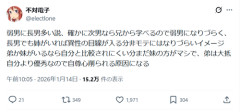 1: 2026/01/16(金) 06:00:53.86 弱男に長男多い説、確かに次男なら兄から学べるので弱男になりづらく、長男でも姉がいれば異性の目線が入る分非モテにはなりづらいイメージ弟か妹がいるなら自分と比較されにくい分まだ妹の方がマシで、弟は大抵自分より優秀なので自尊心削られる原因になる— 不対電子 (@electlone) January 14, 2026 ※関連記事 【朗報】カプコンさん、新作に弱男が好きそうな女キャラを出してしまうwwwwwwww…