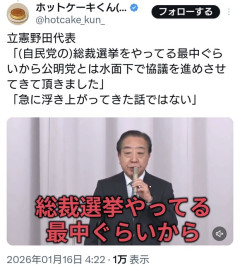 1:2026/01/16(金) 08:20:31.47 ID:x+lJ9OBb0●.net 2BP(2000)立憲野田代表「(自民党の)総裁選挙をやってる最中ぐらいから公明党とは水面下で協議を進めさせてきて頂きました」「急に浮き上がってきた話ではない」 pic.twitter.com/HICwFYj4zc— ホットケーキくん(ペーパーハウス チャンネル) (@hotcake_kun_) January 15, 2026転載元スレッド:…