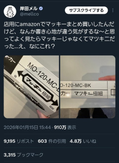 1: 2026/01/16(金) 08:05:32.06 店用にamazonでマッキーまとめ買いしたんだけど、なんか書き心地が違う気がするな〜と思ってよく見たらマッキーじゃなくてマツキニだった…え、なにこれ? pic.twitter.com/WzAoksrV6q— 岸田メル (@mellco) January 15, 2026 ※関連記事 【悲報】Amazon配送、ガチで終わる、超レア品なのに伝票直張りで泣き寝入りwwwwwwwwww…