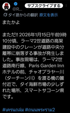 1 名前:名無しさん@涙目です。[sage] 投稿日:2026/01/15(木) 17:31:30.90 ID:4RIYJQnD0 タイ・バンコク郊外でクレーン倒れ2人死亡 2日連続の倒壊事故 タイ・バンコク郊外で進められている高速道路の建設現場で15日朝、クレーンが倒れ、2人が死亡する事故が起きた。地元警察がAFPに明らかにした。タイでは前日にも、高所から落下したクレーンが列車と衝突し、32人が死亡する事故が起きている。 (略) 16 名前:名無しさん@涙目です。[] 投稿日:2026/01/15(木) 17:35:53.51 ID:5hjyYPMX0 今度はラマ2世通りでクレーン倒壊 1人死亡、複数人けが バンコク西郊サムット・サーコーン 【タイ】 バンコク西郊サムット・サーコーン県内のラマ2世通りで1月15日午前9時15分ごろ、高架道路建設のクレーンが倒壊する事故が発生した。 タイでは前日14日、東北部ナコーン・ラーチャシーマー県でクレーンが高架線路から落下し、下を通過中の列車に直撃して100人近い死傷者を出したばかり。 ラマ2世通りの事故は、ターチーン川にかかる橋の手前の下り車線で発生。 クレーンが道路上に倒れ込み、走行中の車両2台が下敷きになった。 通報を受けて急行したレスキュー隊などによると、1人の死亡と複数人の負傷者が確認されている。 現在のところ、そのほかの詳細は不明。 ラマ2世通りは、首都バンコクから中部ペッチャブリー県方面に伸びる国道35号線。バンコクからサムット・サーコーン県の区間で、高速道路(M82)としての再開発が行われている。 2019年着工以降の事故件数は2500件以上といわれ、2024年11月に6人死亡、9人けがの事故、2025年3月に6人死亡、24人けがの事故などが起きている。 หัวเด็ดตีนขาดพี่แฮปก็จะไม่วิ่งเส้นพระราม 2 อีกเลย ลงใต้ยอมอ้อมไปทางราชบุรีเอา #ถนนพระราม2 #เครนถล่ม pic.twitter.com/7PO4oT8ec2— Mr.Hap (@Mr_Whathapened) January 15, 2026 92 名前:名無しさん@涙目です。[sage] 投稿日:2026/01/15(木) 18:20:41.48 ID:pTV7NVF00 昨日同じスレ見たしって思ったらスレタイで置き論破されてて悔しい 107 名前:名無しさん@涙目です。[] 投稿日:2026/01/15(木) 18:48:36.56 ID:/EjtsD8L0 いくら中華と言えども流石にネタだろ...と思ったオレの考えが浅すぎたと今まさに猛省している。 37 名前:名無しさん@涙目です。[] 投稿日:2026/01/15(木) 17:42:12.34 ID:dsrxuhqf0 今日は2人 大分改善してきたな 19 名前:名無しさん@涙目です。[] 投稿日:2026/01/15(木) 17:35:58.78 ID:H34wGqwJ0 いやいやいやいやw 26 名前:名無しさん@涙目です。[sage] 投稿日:2026/01/15(木) 17:38:24.25 ID:qoGS/bbv0 昨日の今日で対策せずにクレーン再開したのか? 28 名前:名無しさん@涙目です。[sage] 投稿日:2026/01/15(木) 17:39:36.17 ID:XWB4tkc20 日本だと、一旦作業が暫く止まるよな 46 名前:名無しさん@涙目です。[sage] 投稿日:2026/01/15(木) 17:44:49.83 ID:KzULSKEn0 何回たてんだよって思ったら 倒れたのが2回目かよ草 58 名前:名無しさん@涙目です。[] 投稿日:2026/01/15(木) 17:50:56.32 ID:Hbea4m1N0 2度あることは? 15 名前:名無しさん@涙目です。[sage] 投稿日:2026/01/15(木) 17:35:43.27 ID:IfMo2vf30 安心と信頼のシナクオリティ 13 名前:名無しさん@涙目です。[sage] 投稿日:2026/01/15(木) 17:35:30.22 ID:Pr0tSyIT0 タイ人殺そうとしてる無茶な設計なのか? 77 名前:名無しさん@涙目です。[] 投稿日:2026/01/15(木) 18:04:34.40 ID:gI/THwpN0 やっぱりいつもの中国がタイに金を融資した金で中国企業が受注して中国人を現地に送り込んで手抜き工事パターン? 85 名前:名無しさん@涙目です。[] 投稿日:2026/01/15(木) 18:10:46.51 ID:NCp7rjsB0 >>77 途中までは日本のODAと同じなのにな 9 名前:名無しさん@涙目です。[] 投稿日:2026/01/15(木) 17:34:49.30 ID:ZcX00CvU0 人命より賄賂が大事!! 21 名前:名無しさん@涙目です。[sage] 投稿日:2026/01/15(木) 17:36:14.78 ID:xAU7cplh0 やっぱり工事は中国指定の中抜キックバック業者がやってるの? 84 名前:名無しさん@涙目です。[sage] 投稿日:2026/01/15(木) 18:09:54.98 ID:BMtwLrZr0 アウトリガーを知らないとか アウトリガー出しときゃ安心とか アポロン付けないとか 地盤しらべないとか 鉄板敷いて分散する事考えないとか 素人やんw そりゃ安くできるだろw 111 名前:名無しさん@涙目です。[] 投稿日:2026/01/15(木) 18:53:51.19 ID:rPenhrIb0 昨日の現場検証とか3分くらいで終わってんの? 88 名前:名無しさん@涙目です。[sage] 投稿日:2026/01/15(木) 18:14:46.13 ID:cK3iBwKm0 どうして 昨日やっちまったから 今日は大丈夫って 思ったんですか 90 名前:名無しさん@涙目です。[sage] 投稿日:2026/01/15(木) 18:16:10.72 ID:8ShZFHpv0 2日連続となるとただのミスではなく工事の計画そのものに問題があると見ていいな ヨシッ みたいな事やってんだろw 122 名前:名無しさん@涙目です。[] 投稿日:2026/01/15(木) 19:04:52.46 ID:EoKhwIjH0 現場マーライオンも苦笑い 68 名前:名無しさん@涙目です。[] 投稿日:2026/01/15(木) 17:59:34.19 ID:GI/SIHjp0 アフターサービスは完成してからのチャイナタイマーで爆発 12 名前:名無しさん@涙目です。[] 投稿日:2026/01/15(木) 17:35:22.23 ID:JMFy3L8g0 ガソリンスタンド連続爆発させたのと