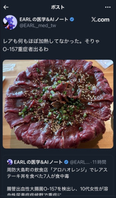 1: 名無しのスコールさん 2026/01/17(土) 01:36:19.41 ID:MVmqdwwL0 レアステーキ丼か 10代女性がO157食中毒で重症 店は営業停止に 山口・周防大島町 テレビ山口 テレビ山口 2026年1月15日(木) 16:32 1月4日、山口県周防大島町の飲食店で料理を食べた7人が食中毒の症状を訴え、3人から腸管出血性大腸菌O157が確認されました。 10代の女子1人が重症です。 山口県生活衛生課によると1月4日、周防大島町の飲食店「アロハオレンジ」で食事をした7人が食中毒の症状を訴えました。 このうち3人から腸管出血性大腸菌O157が確認され、10代の女性1人が尿毒症を発症する重症となっています。 店が提供したレアステーキ丼が原因とみられ、ほかにも同じ料理を食べた人がいるということです。 柳井環境保健所は食品衛生法に基づき1月18日まで店に営業停止を命じ、施設内外の清掃や消毒などを指導しています。 県生活衛生課は加熱調理する食品は十分に加熱するなど食中毒の予防を呼びかけています。 引用元: ・…
