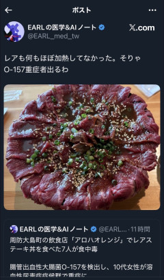 引用元: それでも動く名無し 2026/01/17(土) 01:36:19.41 ID:MVmqdwwL0 レアステーキ丼か 10代女性がO157食中毒で重症 店は営業停止に 山口・周防大島町 テレビ山口 テレビ山口 2026年1月15日(木) 16:32 1月4日、山口県周防大島町の飲食店で料理を食べた7人が食中毒の症状を訴え、3人から腸管出血性大腸菌O157が確認されました。 10代の女子1人が重症です。 山口県生活衛生課によると1月4日、周防大島町の飲食店「アロハオレンジ」で食事をした7人が食中毒の症状を訴えました。 このうち3人から腸管出血性大腸菌O157が確認され、10代の女性1人が尿毒症を発症する重症となっています。 店が提供したレアステーキ丼が原因とみられ、ほかにも同じ料理を食べた人がいるということです。 柳井環境保健所は食品衛生法に基づき1月18日まで店に営業停止を命じ、施設内外の清掃や消毒などを指導しています。 県生活衛生課は加熱調理する食品は十分に加熱するなど食中毒の予防を呼びかけています。 7: それでも動く名無し 2026/01/17(土) 01:38:16.81 ID:ZiifgxIO0 レア過ぎて生臭 8: それでも動く名無し 2026/01/17(土) 01:38:17.22 ID:cMV8L5pH0 何でこれ出したんや…どう見てもほぼ生やん…