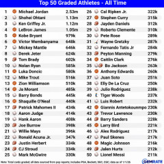 転載元: それでも動く名無し 2026/01/18(日) 16:02:57.82 ID:WQ4e1clD0 大谷はジョーダンに次ぐ2位で113万枚、ジャッジは18位 1) 🏀 Michael Jordan -> 2.53m 2) ⚾ Shohei Ohtani -> 1.13m 3) ⚾ Ken Griffey Jr. -> 1.12m 4) 🏀 LeBron James -> 1.05m 5) 🏀 Kobe Bryant -> 979k 6) 🏀 Victor Wembanyama -> 648k 7) ⚾ Mickey Mantle -> 646k 8) ⚾ Derek Jeter -> 624k 9) 🏈 Tom Brady -> 609k 10) ⚾ Nolan Ryan -> 585k 11) 🏀 Luka Doncic -> 516k 12) ⚾ Mike Trout -> 515k 13) 🏀 Zion Williamson -> 510k 14) 🏀 Ja Morant -> 493k 15) ⚾ Barry Bonds -> 472k 16) 🏀 Shaquille ONeal -> 470k 17) 🏈 Patrick Mahomes II -> 449k 18) ⚾ Aaron Judge -> 413k 19) ⚾ Hank Aaron -> 408k 20) 🏈 Joe Burrow -> 398k…