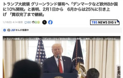 1 : アメリカのトランプ大統領は、デンマーク自治領グリーンランドの領有に同調しないヨーロッパ各国からの輸入品に対し、2月から10%の関税を課すと表明しました。 トランプ大統領は17日SNSで、デンマーク自治領グリーンランドの領有をめぐり、アメリカに同調しないヨーロッパ各国に関税を課すと表明しました。 対象はデンマーク、ノルウェー、スウェーデン、フランス、ドイツ、イギリス、オランダ、フィンランドの8か国で、2月1日から10%の関税を課すとしています。 さらに、6月1日からは関税率を25%に引き上げるとしたうえで、アメリカによる「グリーンランドの完全かつ全面的な買収」で合意に至るまでこの関税が継続されるとしています。 トランプ氏は「世界の平和がかかっている!中国とロシアはグリーンランドを狙っているが、デンマークに阻止する手段はない」と強調し、アメリカによるグリーンランドの領有が安全保障上必要だと改めて主張しています。全文はソースで 2 : もうめちゃくちゃ 3 : 世界の敵に…