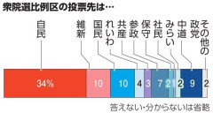 比例投票先、自民34%、中道9%、国民10%、維新10%