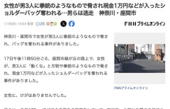 1 : 神奈川・座間市で女性が男3人に拳銃のようなもので脅され、バッグを奪われる事件がありました。 17日午後11時50分ごろ、座間市緑が丘の路上で、女性が、男3人に「動くな」と刃物や拳銃のようなもので脅され、現金1万円などが入ったショルダーバッグを奪われる事件がありました。 男らは、身長170cmほどで全身黒色の服装をしていて、犯行後、北側に位置する相武台前駅方面に逃走したということです。 2 : 1人3333円 リスクに全く見合ってないわ…