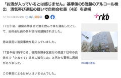 2 : 「お酒が入っているとは感じません」基準値の5倍超のアルコール検出 酒気帯び運転の疑いで自称会社員(48)を逮捕 17日午後1時半ごろ、福岡市博多区板付の県道112号の交差点で「止まっている車に追突した」と男から警察に通報がありました。 この事故によるけが人はいませんでした。 駆けつけた警察官が追突した軽貨物車を運転していた男の呼気を調べたところ、基準値の5倍を超えるアルコールが検出されたため、男を酒気帯び運転の疑いで現行犯逮捕しました。 逮捕されたのは福岡市東区に住む自称会社員の男(48)です。 取り調べに対し男は「昨日、自宅で22時から24時までアルコール度数7%の缶チューハイを3本くらい飲んだ」と話したうえで、「私の体にお酒が入っているとは感じませんでした、つまり飲酒運転はしていません」と容疑を否認しています。 3 : 私の血は酒だ 5 : まーた福岡だよ…