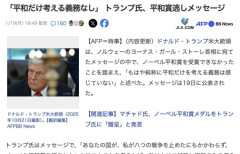 1 : 「平和だけ考える義務なし」 トランプ氏、平和賞逃しメッセージ(AFP=時事) - Yahoo!ニュース ドナルド・トランプ米大統領は、ノルウェーのヨーナス・ガール・ストーレ首相に宛てたメッセージの中で、ノーベル平和賞を受賞できなかったことを踏まえ、「もはや純粋に平和だけを考える義務は感じていない」と述べた。メッセージは19日に公表された。 トランプ氏はメッセージで、「あなたの国が、私が八つの戦争を止めたにもかかわらず、ノーベル平和賞を授与しないと決めたことを考えれば、私はもはや純粋に平和のみを考える義務は感じていない」と記した。全文はソースで…