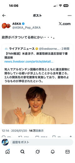 1: 名無し 2026/01/20(火) 14:06:28.22 ID:AlmjZ/uT0 2: 名無し 2026/01/20(火) 14:07:13.42 ID:AlmjZ/uT0 政界の闇やね 3: 名無し 2026/01/20(火) 14:07:32.22 ID:iCiPKVA40 これ毎回言い出す奴いるけど、芸能人の逮捕にどんだけ価値見出してんだよ笑 【画像】上坂すみれさんがカルバンクラインの下着を着けた結果www【動画】ドスケベコスプレイヤーの準備風景、ガチでエ口すぎるwwwwww【画像】身長180cmの爆乳デカ女ウクライナ人、来日www【朗報】メルカリにて、「謎の絵」が大量に売れまくるwww【悲報】女の陰湿な旦那イジメ、限界突破するwwww【画像】歯医者にガチの「合法口リ(139cm)」みたいな衛生士がいるんだがwwww【悲報】「お●ぱいがズレてる」と韓国女性に日本人が指摘した件、ちょっとヤバいwwwww教頭「いじめ、10人の加害者と1人の被害者の未来、どっちが大切ですか?」→大炎上してしまう・・・【画像】株に全財産と運をかけた男の末路が悲惨すぎる…