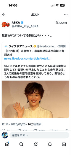1:それでも動く名無し:2026/01/20(火) 14:06:28.22 ID:AlmjZ/uT0 2:それでも動く名無し:2026/01/20(火) 14:07:13.42 ID:AlmjZ/uT0 政界の闇やね 3:それでも動く名無し:2026/01/20(火) 14:07:32.22 ID:iCiPKVA40 これ毎回言い出す奴いるけど、芸能人の逮捕にどんだけ価値見出してんだよ笑…