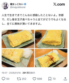 1: 2026/01/20(火) 21:38:39.82 人生で生きてきてこんなに感動したことないよ。京都で、だし巻き玉子食べちゃうと全てがどうでもよくなるし、全てに興味が湧いてきますよ。 pic.twitter.com/h7ANCaSCdb— 魔女っこれい (@majyokkorei) January 16, 2026 出汁巻きに直接醤油をだぶだぶにかけるとか、信じられへんわ😩東の人間やることは、これやから… — ゑつ (@etsujiro) January 17, 2026 ※関連記事 【緊急画像】東京人さん、「名古屋メシ台湾ラーメン」に殺到&大行列www矢場味仙ヤバwww…