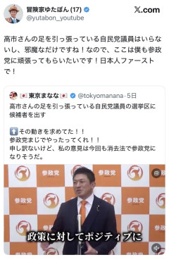 ゆたぽん「高市さんの邪魔をする自民党議員はいらない。参政党がんばれ」