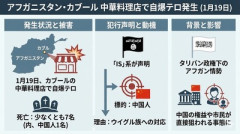 1: 名無し 2026/01/20(火) 19:48:32.41 ID:Rw8kPz2m0 アフガニスタンの首都カブールのホテルに併設する中華料理店で19日、爆発が起き、中国人1人を含む少なくとも7人が死亡した。過激派組織「イスラム国」(IS)系武装勢力が自爆攻撃を行ったとの犯行声明を出した。「中国政府による(イスラム教徒の少数民族)ウイグル族に対する虐待が深刻化している」ことから、中国人を標的に加えたと主張している。 Yahoo!ニュース(時事通信) ■要約 ・1月19日、アフガニスタンのカブールにある中華料理店で自爆テロが発生した ・この爆発により中国人1名を含む少なくとも7名の死亡が確認されている ・過激派組織「IS」系が、ウイグル族への対応を理由に中国人を標的としたと声明を出した ・タリバン政権下のアフガンで、中国の権益や市民が直接狙われる事態となっている ■解説 アフガニスタンにおいて、中国人が明確に「標的」とされたことは非常に重い意味を持ちます。中国はタリバン政権との関係構築を急ぎ、一帯一路を通じた資源開発やインフラ投資を加速させてきましたが、今回のテロはその「進出リスク」を浮き彫りにしました。 IS系勢力が「ウイグル族への虐待」を犯行の口実に挙げている点に注目すべきです。中国共産党による国内の強硬な統治が、海外のイスラム過激派を強く刺激する構図が鮮明になっており、今後も世界各地の中国関連施設が同様の脅威にさらされる可能性は否定できません。 高市政権が進める経済安全保障や邦人保護の観点からも、今回の事例は他山の石とすべきでしょう。地政学的リスクが極めて高い地域での権益拡大は、結果として自国民を危険にさらすことにつながります。日本としては、米国や同志国と連携しつつ、中国の強硬姿勢が招く負の連鎖を冷静に分析し、安全保障上の備えをより強固にする必要があります。 【中革連】立憲民主党さん、学会表ほしさにあっさり原発ゼロを撤回 → 安住幹事長「再稼働は容認してた!」 → ネット「立憲HPに全ての原発停止と廃... 【悲報】 一発屋漫画家「くそっ何度連載してもすぐ打ち切りになってしまう、せや!昔売れた漫画の新作描こw」 私がパスタを食べていた。こっちはまだですか? → 無言でカレはずっとこうします……