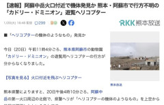 1 : 今日(20日)午前11時4分ごろ、熊本県阿蘇市の動物園「カドリー・ドミニオン」の遊覧用ヘリコプターの行方が分からなくなりました。 警察によりますと、阿蘇中岳の第一火口周辺の北側で「ヘリコプターの機体のようなものを目視で確認した」ということです。 カドリー・ドミニオンなどによりますと、遊覧ヘリは園発着で草千里や阿蘇中岳を10分間巡るもので、64歳の男性パイロットと、台湾出身の客2人(男性41歳、女性36歳)が搭乗していますが、午後5時現在、安否はわかっていません。 ■スマートフォンの“衝撃”で通報 消防によりますと今日(20日)午前11時4分ごろ、乗客のスマートフォンの衝撃で消防に通報がありました。消防が折り返すものの、つながらないということです。 また、午前11時50分ごろには阿蘇市にある動物園カドリー・ドミニオンから警察に、「帰ってくる予定のヘリコプターが帰ってこない」と通報がありました。 続きは↓ 9 : 視界不良で衝突したのか風に煽られたかどっちや 160 : >>9 高濃度火山ガス噴出でヘリパイロットが意識を失ったとかかもしれん。…