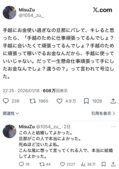1: 2026/01/21(水) 02:23:14.77 手越にお金使い過ぎなの旦那にバレて、キレると思ったら、「手越のために仕事頑張ってるんでしょ?手越に会いたくて頑張ってるんでしょ?手越のために頑張って稼いでるお金なんだから、手越に使っていいじゃない。だって一生懸命仕事頑張って手にしたお金なんでしょ?違うの?」って言われて号泣した。— MisuZu (@1054_zu_) January 18, 2026 ※関連記事 【画像】オタクさん、推し声優が目の前にいるにも関わらずスマホに夢中で気が付かずwww…