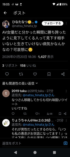 1:以下、?ちゃんねるからVIPがお送りします:2026/01/20(火) 19:10:32.084 ID:hIF/z4Xy0.net 萎えるからSNSやらない方が良い 8:以下、?ちゃんねるからVIPがお送りします:2026/01/20(火) 19:11:51.147 ID:deEXRZW30.net おそらく8割の男女が見下すと思う…