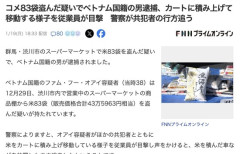 2 : コメ83袋盗んだ疑いでベトナム国籍の男逮捕、カートに積み上げて移動する様子を従業員が目撃 警察が共犯者の行方追う ベトナム国籍のファム・フー・オアイ容疑者(当時38)は12月29日、渋川市内で営業中のスーパーマーケットの商品棚から米83袋(販売価格合計43万5963円相当)を盗んだ疑いが持たれています。 警察によりますと、オアイ容疑者がほかの共犯者とともに米をカートに積み上げ移動している様子を従業員が目撃し声をかけると、米を積んだ車などを放置したまま逃走したということです。 全文はソースで…