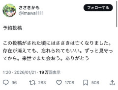 1: 2026/01/21(水) 17:19:11.84 予約投稿この投稿がされた頃にはささきは亡くなりました。存在が消えても、忘れられてもいい。ずっと見守ってから。来世でまた会おう。ありがとう— ささきかも (@imawa1111) January 20, 2026 承認欲求 pic.twitter.com/JFnLZTnAF0— ささきかも (@imawa1111) November 30, 2025 ※関連記事 【悲報】21歳たち、自ら命を絶つ……