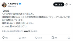 1: 2026/01/21(水) 17:00:29.93 【緊急】へずまりゅう刑事告訴されました。国歌斉唱を歌わなかった共産党奈良の汚職議員がパフォーマンスとして自分に攻撃をしています。謝罪はしないし投稿も消しません。さっさと日本から出て行け。— へずまりゅう (@hezuruy) January 21, 2026 ※関連記事 【画像】へずまりゅう「国歌斉唱で起立しなかった共産党議員を晒します」リプ欄は賛同一色、いいねは18.5万超え…