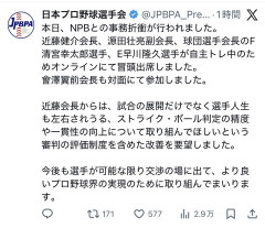 1: 名無しさん 2026/01/21(水) 15:41:47.26 ID:xFn7e0660 本日、NPBとの事務折衝が行われました。近藤健介会長、源田壮亮副会長、球団選手会長のF清宮幸太郎選手、E早川隆久選手が自主トレ中のためオンラインにて冒頭出席しました。會澤翼前会長も対面にて参加しました。…— 日本プロ野球選手会 (@JPBPA_Press) January 21, 2026…