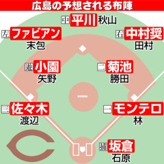 【広島】予想布陣イラスト&オーダー 投手は栗林ら先発転向、攻撃陣は昨季2冠の小園ら中心 2年連続Bクラスをへて、変革が求められる。昨秋ドラフトでは育成含め、大学生と独立リーグ出身者を8人指名。2年目の佐々木らフレッシュな戦力の台頭が底上げにつながる。 32年ぶり2桁勝利なしに終わった先発は陣容を整えた。通算134セーブの栗林、2年目の岡本、辻が中継ぎから先発に転向。新外国人ターノックを獲得し、先発争いは激しくなりそうだ。一方で既述した投手が抜けるブルペンは再整備が必要だ。昨秋アピールした益田や新人など新たな戦力の台頭は欠かせない。 攻撃陣は、昨季2冠の小園と外国人が中心となる。昨季不振の坂倉に加え、経験を積んだ中村奨や佐々木ら若手がどれだけレギュラーに定着できるかが、打線の完成度を左右する。 (全文はリンク先) ・平川、勝田が使えれば嬉しいけどまだルーキーだから未知数…