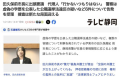 1 : 田久保前市長に出頭要請 代理人「行かないつもりはない」 警察は虚偽の学歴を公表した公職選挙法違反の疑いなど6件について告発を受理 捜査は新たな局面迎える テレビ静岡1/21(水) 12:37配信 虚偽の学歴を公表した公職選挙法違反の疑いなど、複数の容疑について刑事告発されている伊東市の田久保眞紀 前市長について、静岡県警が任意の事情聴取に応じるよう要請したことがわかりました。 田久保前市長の“懐刀”福島弁護士が激白 「全国の弁護士が立ち上がってくれる」 押収拒絶権の行使に自信 権利の濫用との批判に“反論” 「法律家同士フェアにやりましょう」 伊東市の田久保眞紀 前市長は2025年5月に行われた市長選にあたり、実際には東洋大学を除籍されていたにもかかわらず報道機関に対する経歴調査票に同大学法学部卒業と記したほか、当選後に発行された市の広報誌にも同様の経歴を記載しました。全文はソースで…