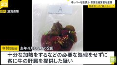 1: 黒(茸) [HU] 2026/01/22(木) 11:33:14.92 ID:IqUTr4Eq0● BE:567637504-PLT(56555) 生の牛レバーを客に提供したとして、滋賀県警東近江署は21日、京都市左京区、飲食店経営の男(55)を食品衛生法違反の容疑で逮捕した。 発表によると、男は昨年4月18日と同9月12日、自身が経営する滋賀県豊郷町安食南の飲食店「肉料理滋ぃ家」で、加熱処理していない牛レバーを生食用として提供した疑い。 メニューに記載せず、常連客にのみ提供していたといい、客が持ち帰って同署に提出した。男は調べに対し、「間違いありません」と容疑を認めているという。…