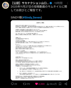 1: 2026/01/22(木) 13:30:05.88 2025年11月27日の投稿動画のサムネイルに関してお詫びとご報告です。SINDY様(#Sindy_Seven) pic.twitter.com/OURslLPNXN— 【公認】サカナクション山口一郎の切り身ちゃんねる (@ichiro_kirimi) January 21, 2026 ※関連記事 一番手Vグループの切り抜き漫画を投稿したら10万再生されたンゴ…