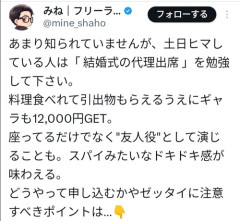 1: 2026/01/22(木) 11:52:31.39 あまり知られていませんが、土日ヒマしている人は「 結婚式の代理出席 」を勉強して下さい。料理食べれて引出物もらえるうえにギャラも12,000円GET。座ってるだけでなく"友人役"として演じることも。スパイみたいなドキドキ感が味わえる。どうやって申し込むかやゼッタイに注意すべきポイントは…👇— みね|フリーランス特化の税理士 (@mine_shaho) December 16, 2025 ※関連記事 【画像】たわわ女さん「この度、Tiffanyの婚約指輪を貰いました。結婚しました。弱男息してる??」…