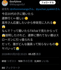1: それでも動く名無し : 2026/01/22(木) 18:52:18.89 ID:O2nl33aBr 引用元: 【悲報】「高市さんを応援するなら参政党」とかいうトンデモ情報、TikTokで大拡散されてしまうwwww…