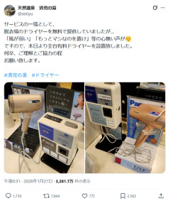 1: 2026/01/22(木) 19:08:29.90 サービスの一環として、脱衣場のドライヤーを無料で提供していましたが…「風が弱い」「もっとマシなのを置け」等の心無い声が😮💨ですので、本日より全台有料ドライヤーを設置致しました。何卒、ご理解とご協力の程お願い致します。#清児の湯 #ドライヤー pic.twitter.com/6XXNLvC4Q3— 天然温泉 清児の湯 (@setiyu) January 21, 2026 それを現場スタッフがまともに喰らいますから😮💨— 天然温泉 清児の湯 (@setiyu) January 21, 2026 お客さんの声を改善余地と捉えるのではなく「心無い声」と捉えてしまう人は商売に向いてないと思います。 — すきま投信 (@sukima_toushin) January 22, 2026 客の言い方が相当酷かったのかもしれないけど、完全無料の施設ではなくて銭湯料払ってるんだから設備への要望を言うこと自体は悪くなくない?現状の料金では無理だから別途料金もらうって判断はもちろん間違ってないけど、「無料で」ってところが店と客で認識揃ってなかったんじゃないかな〜と — ぜろふえ (@fere_amai) January 21, 2026 なんで金払ってる上に要望を伝えただけなのに客がワガママ言ってるみたいになってんの??? — 名前 (@chrome__san) January 21, 2026 有料化の理由が意味不明「1人で長時間使ってる人がいるから有料化します」なら分かるけど、「文句言われてムカつくから有料化する😡」は理解不能 — 白色コウノトリ 反共勝利 🇯🇵 (@nihonraichou211) January 22, 2026 ※関連記事 ドライヤーに万出せるやつってすごいな…
