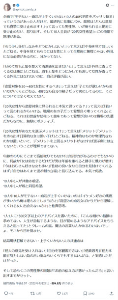 1: 2026/01/22(木) 19:35:58.79 企画で「モテない・婚活が上手くいかない10人の40代男性をバッサリ斬る」っていうのがあったんだけど、最終的に見事にボツ。最初は「どんな意見でも真摯に受け止めます!」って言ってた男性陣、いざ斬られると絶対に受け止めない、怒り出す。そして10人全員が「20代女性希望」←この段階で無理がある。…— 杏 (@apricot_candy_a) April 27, 2023 ※関連記事 【悲報】20代社長、40代おっさんの「了解です」にブチギレwwww…