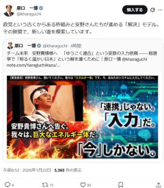 1. 匿名@ガールズちゃんねる 原口氏は22日深夜2時45分にXを更新し、「『ゆうこく連合』という変数の入力依頼--総選挙で『明るく温かい日本』という解を導くために」と題したnoteを公開。安野氏への思いをつづった。noteは「1.私が提供できる『変数(リソース)』」「2.時代の『OSアップデート』」「3.あなたへの依頼:『入力』と『入党』」の3章立てで構成されており「私たちを、チームみらいに入党させてください」とラブコールを送った。 さらに午前6時52分にもXを更新し「政党という古くからある枠組みと安野さんたちが進める『解決』モデル。その狭間で、新しい道を模索しています」とつづった。 関連トピ 2026/01/22(木) 14:06:24…